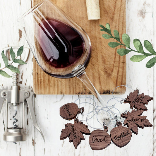 Thanksgiving Wine Charms Set of 6 – Engraved Wood with Gratitude Words – Acorn & Leaf Shapes