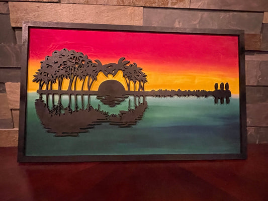 Ocean Wall Art – Layered Blue Wood Palm Tree Beach Decor – 18.5x8 Coastal Sunset Artwork – Tropical Home or Beach House Gift