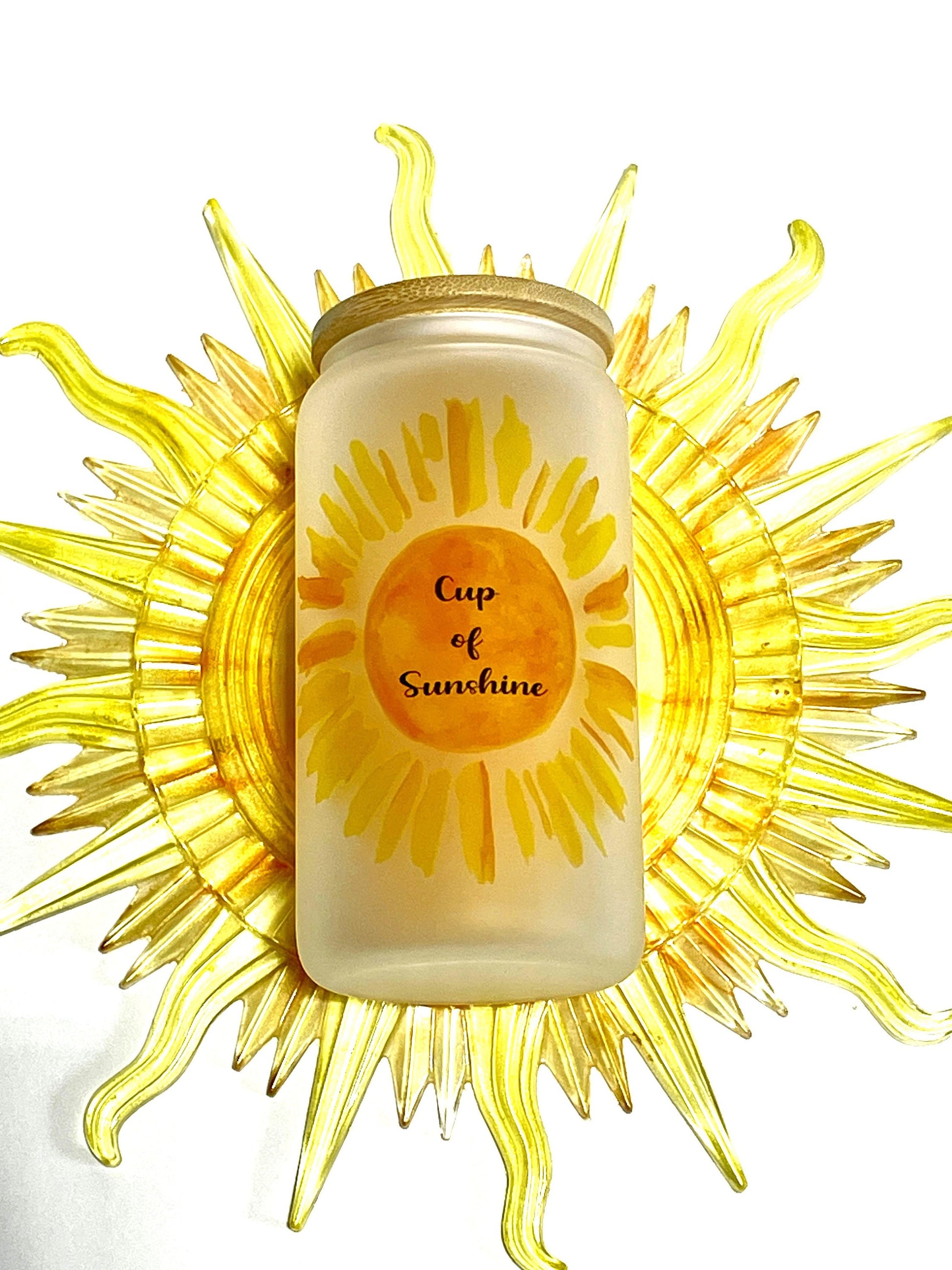 Enchanting 16-ounce Frosted Glass Tumbler adorned with a radiant "Cup of Sunshine" design, destined to infuse your day with positivity.