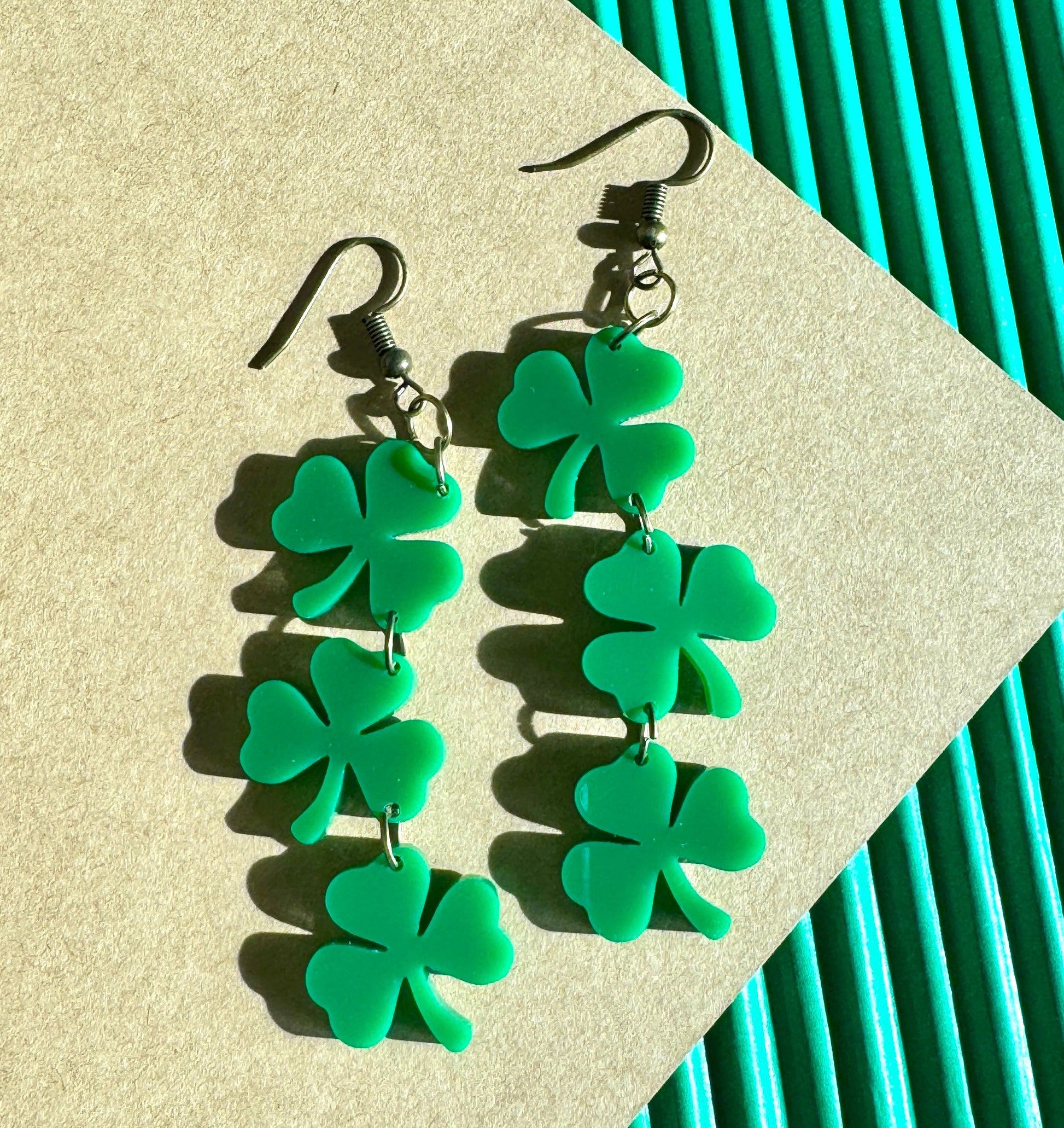Charming Dangling Clover Earrings, available in your choice of a rich Walnut wood finish or a vibrant bright green acrylic. These beautifully crafted earrings feature three delicate clovers, making them the ideal accessory for St. Patrick's Day or whenever a touch of luck is in order.