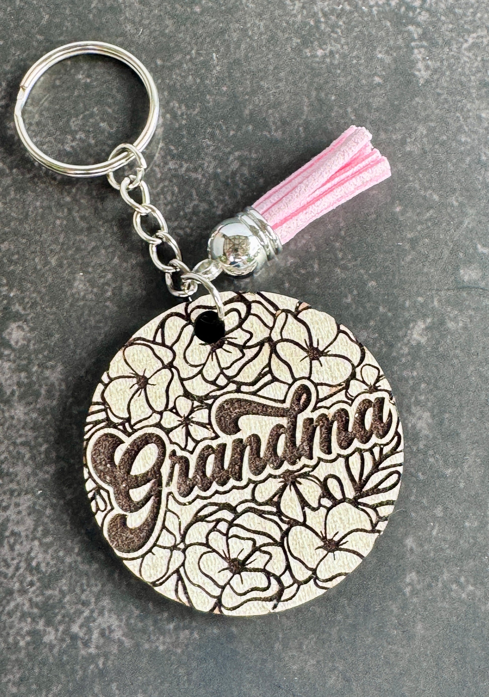 Floral Laser Engraved Keychain – Wood Mama or Grandma Charm