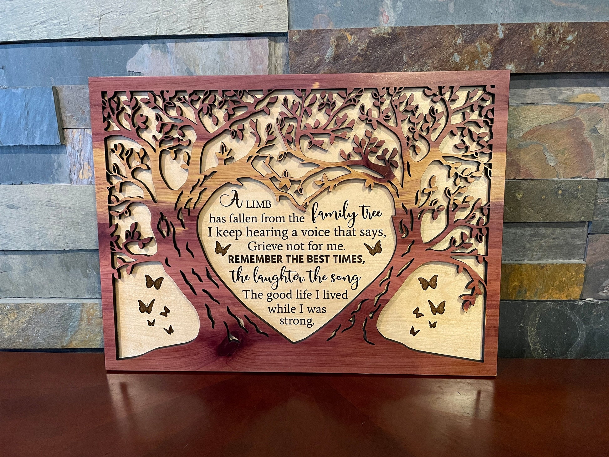 Honor the memory of a loved one with this beautifully handcrafted 2-layer wooden sign, designed to bring warmth and comfort. Crafted from 1/4 inch maple and topped with 1/4 inch cedar, this sign is shaped like a tree and measures 14x10 inches, symbolizing life and remembrance. At the heart of the design, a heartfelt poem is engraved, adding a deeply personal and meaningful touch to this keepsake.