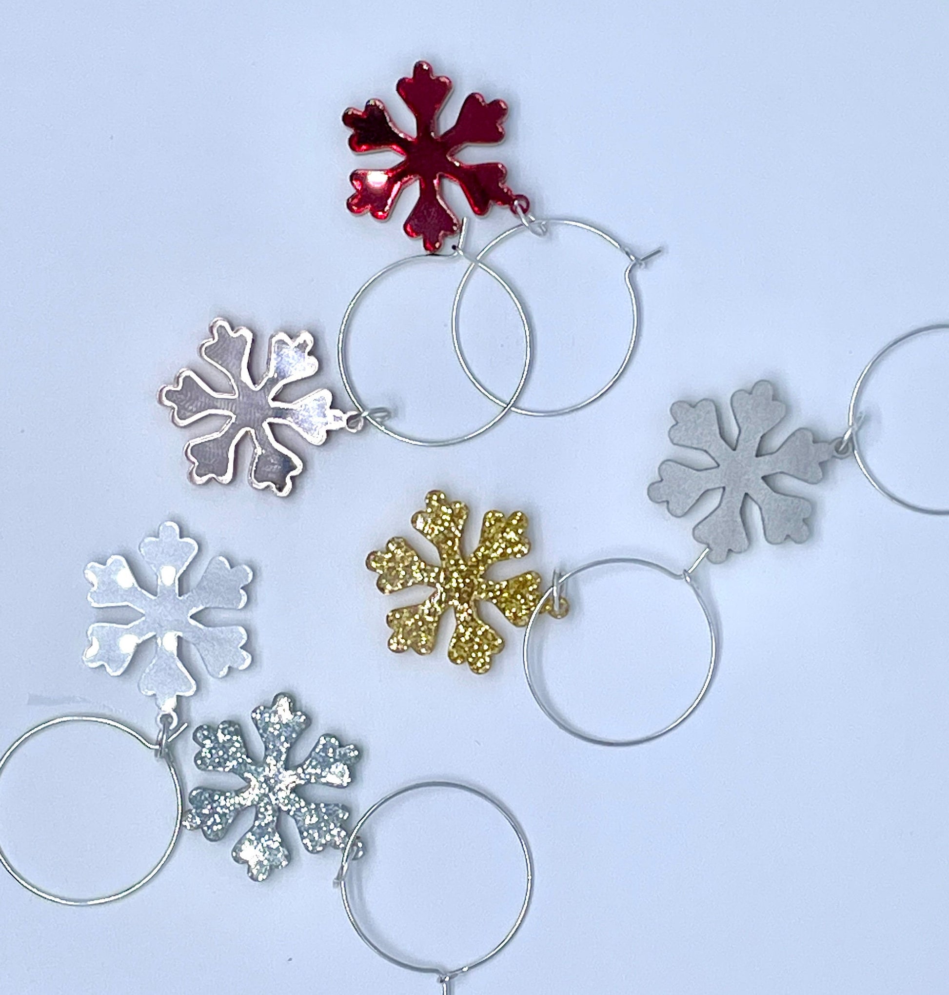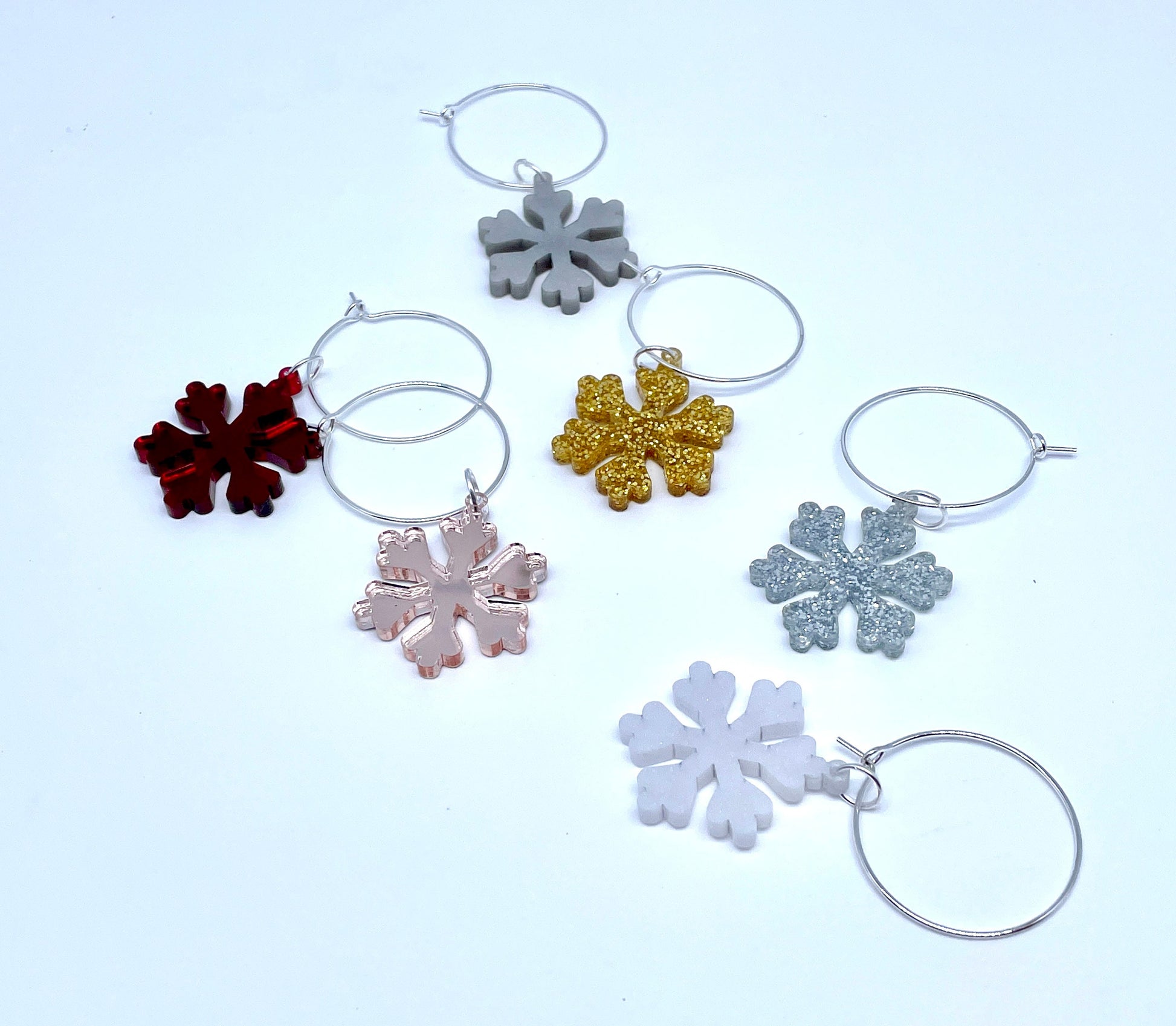 Elevate your winter gatherings with our dazzling set of 6 Snowflake Wine Charms. Each charm is crafted to add a touch of sparkle to your wine glasses, making every sip a little more festive. The set features six unique designs in a range of stunning colors, including Gold Glitter, Silver Glitter, Red Mirror, Rose Gold Mirror, White Pearl, and Grey Pearl Acrylic.