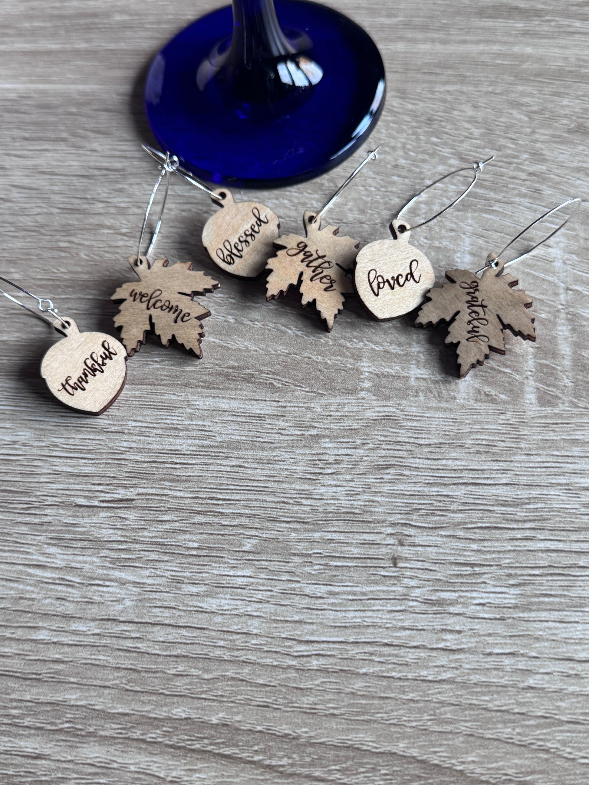 Thanksgiving Wine Charms Set of 6 – Engraved Wood with Gratitude Words – Acorn & Leaf Shapes