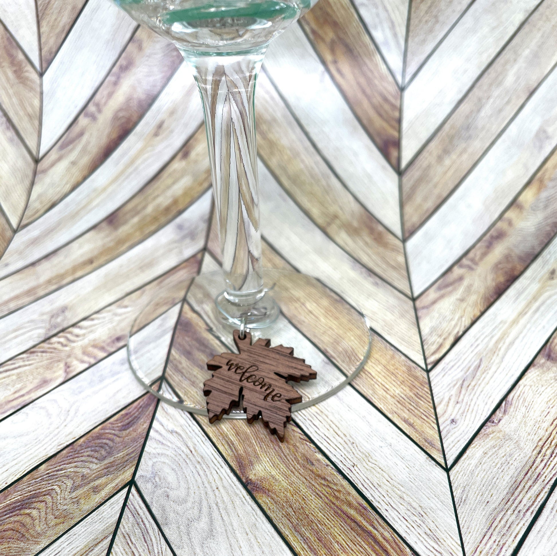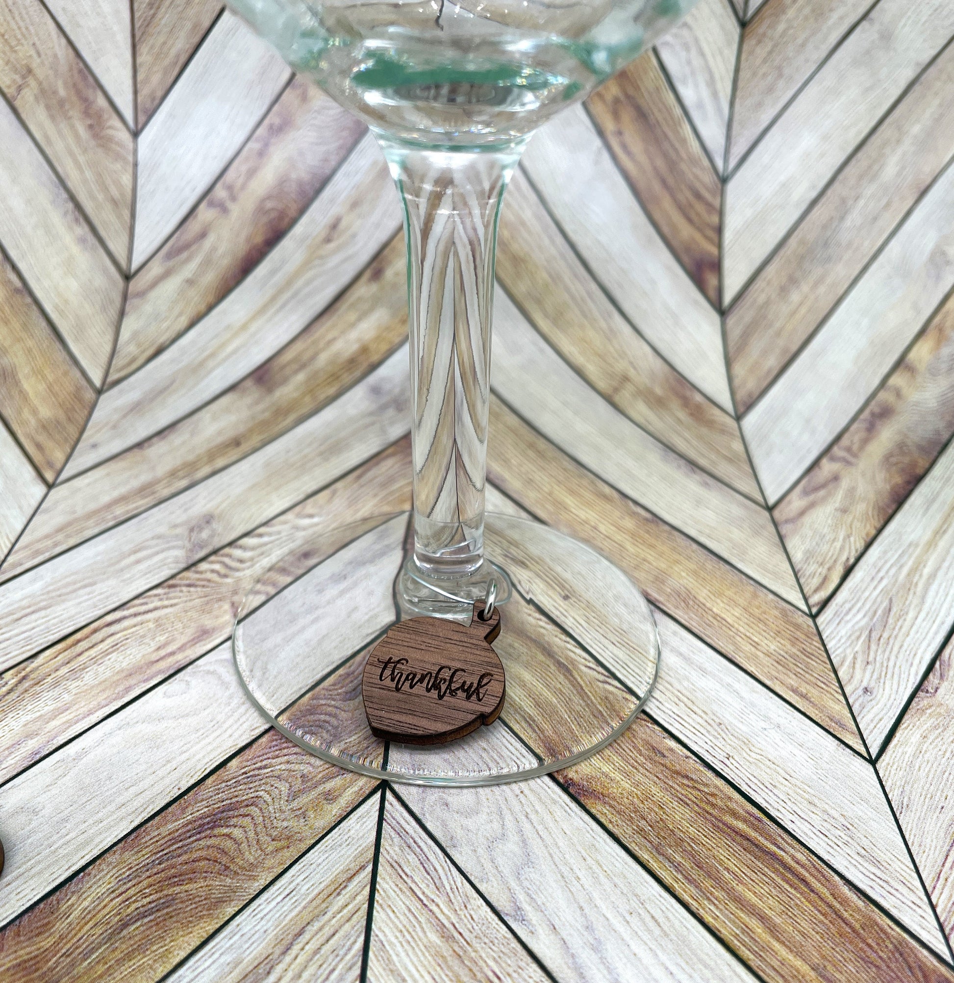 Add a touch of warmth and gratitude to your Thanksgiving table with these charming wine charms. This set of 6 features elegant walnut wood charms engraved with heartfelt words: "Thankful," "Blessed," "Grateful," "Welcome," "Loved," and "Gather." Each charm measures 1 inch and comes with hardware for easy attachment to your wine glasses.
